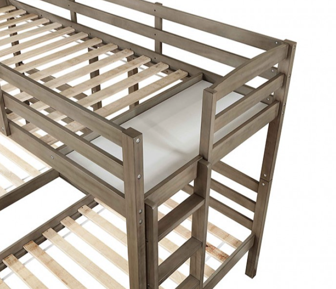 The Hortense Triple Twin bunk bed combines solid wood and wood veneer in a warm gray finish, offering a cozy loft-style design. Its versatile reversible ladder and built-in nightstand with drawer provide practical convenience, while the USB port and power outlet keep devices charged and accessible. Safety is prioritized with sturdy guardrails, and the bed is mattress ready for easy setup. Perfect for maximizing space with comfort and functionality.