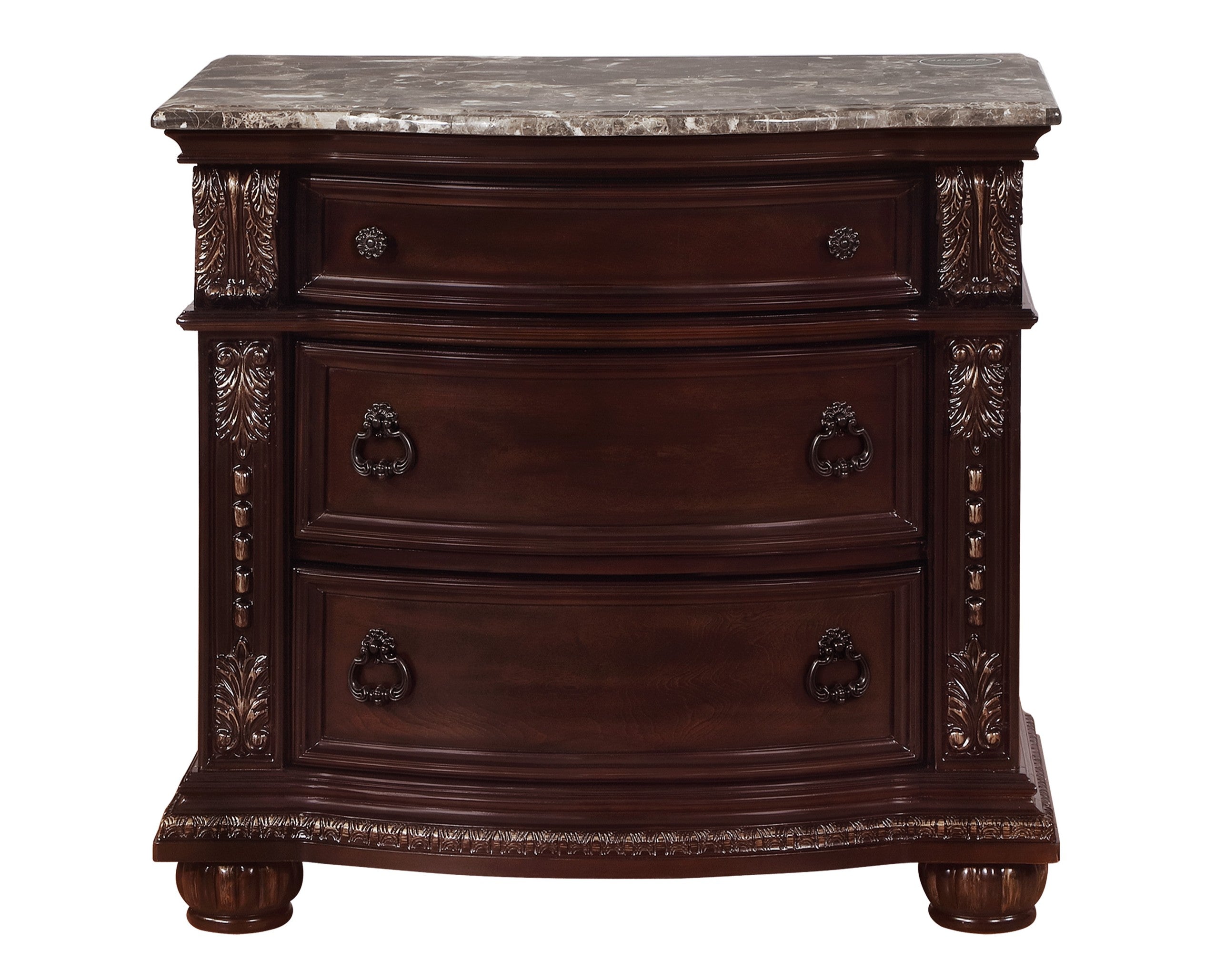 Add a touch of elegance to your room with the Stanley Nightstand. Featuring a rich brown finish, this nightstand is adorned with intricate rope twists and detailed carvings. The marble tops and golden highlights add a luxurious touch, making this nightstand a statement piece in any home.